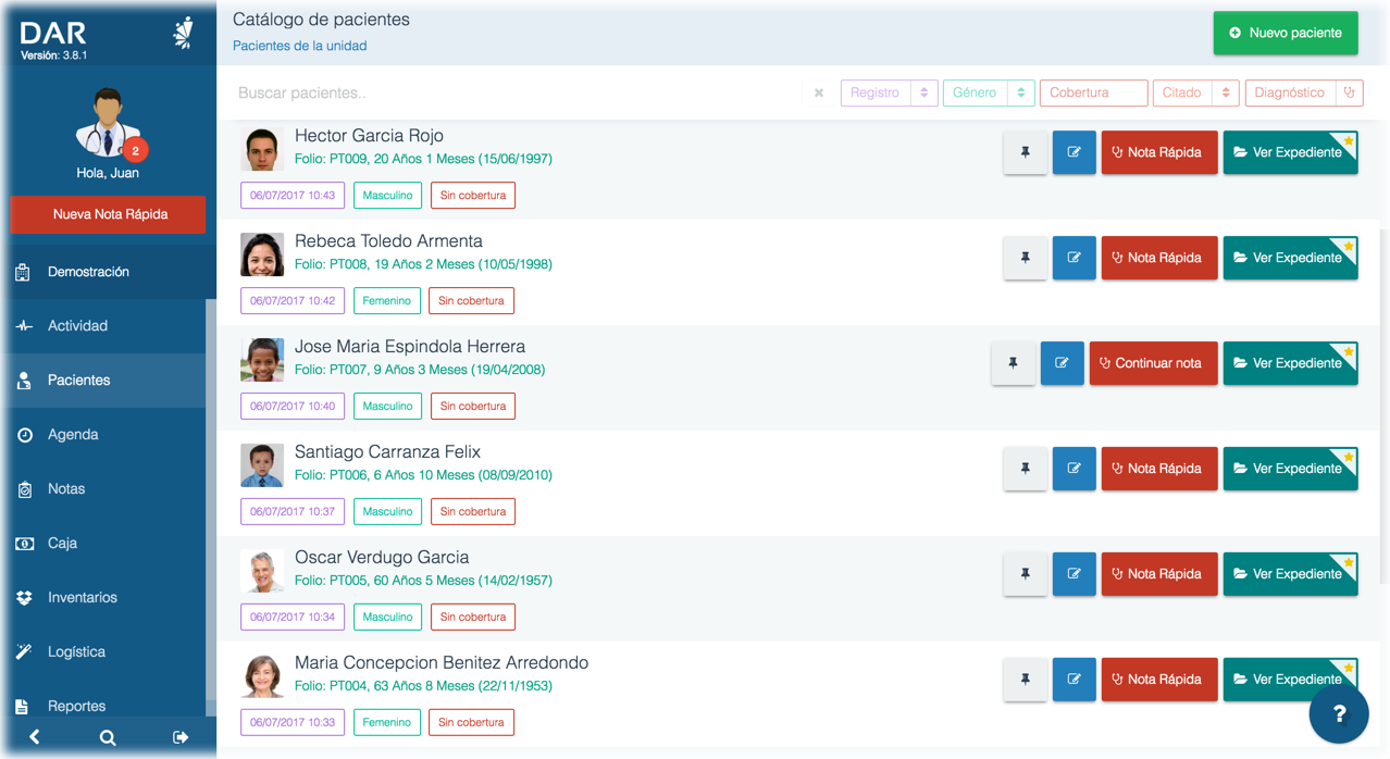 Alta, edición y acceso rápido a las características principales del sistema como notas y expediente.