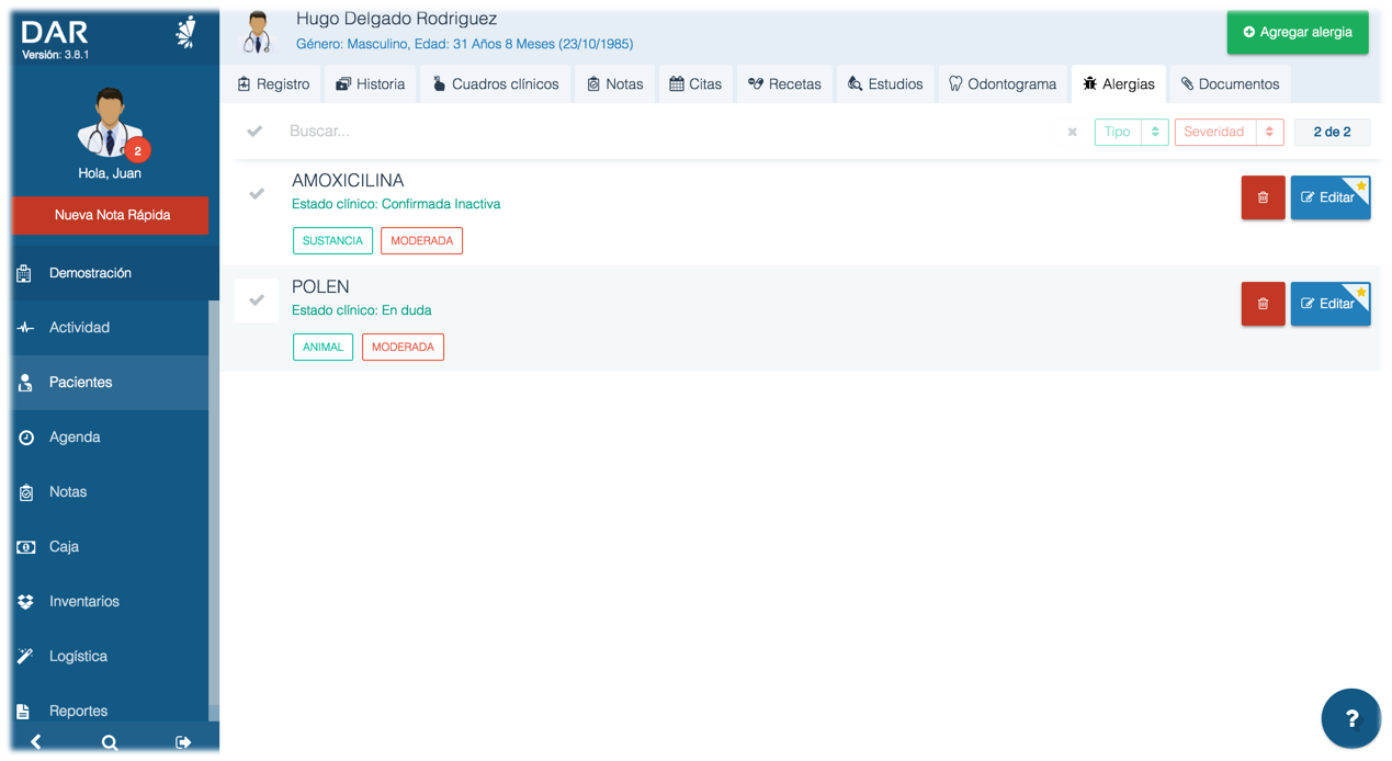 Registro de alergias del paciente, sustancias activas o ambiente, estas arrojarán alertas al recetarse.