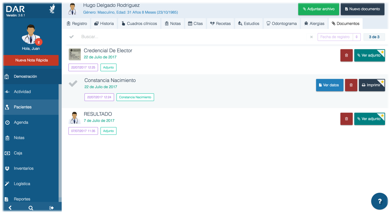 Alta de documentos tipo constancia y alta de archivos del paciente, videos, imágenes, PDF, etc.