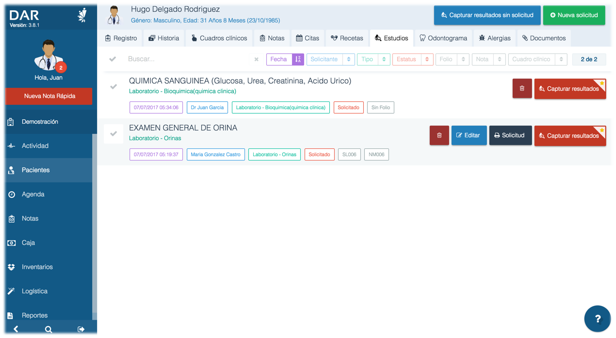 Listado de estudios de laboratorio, consulta, alta y captura de resultados, conexión con equipos, etc.
