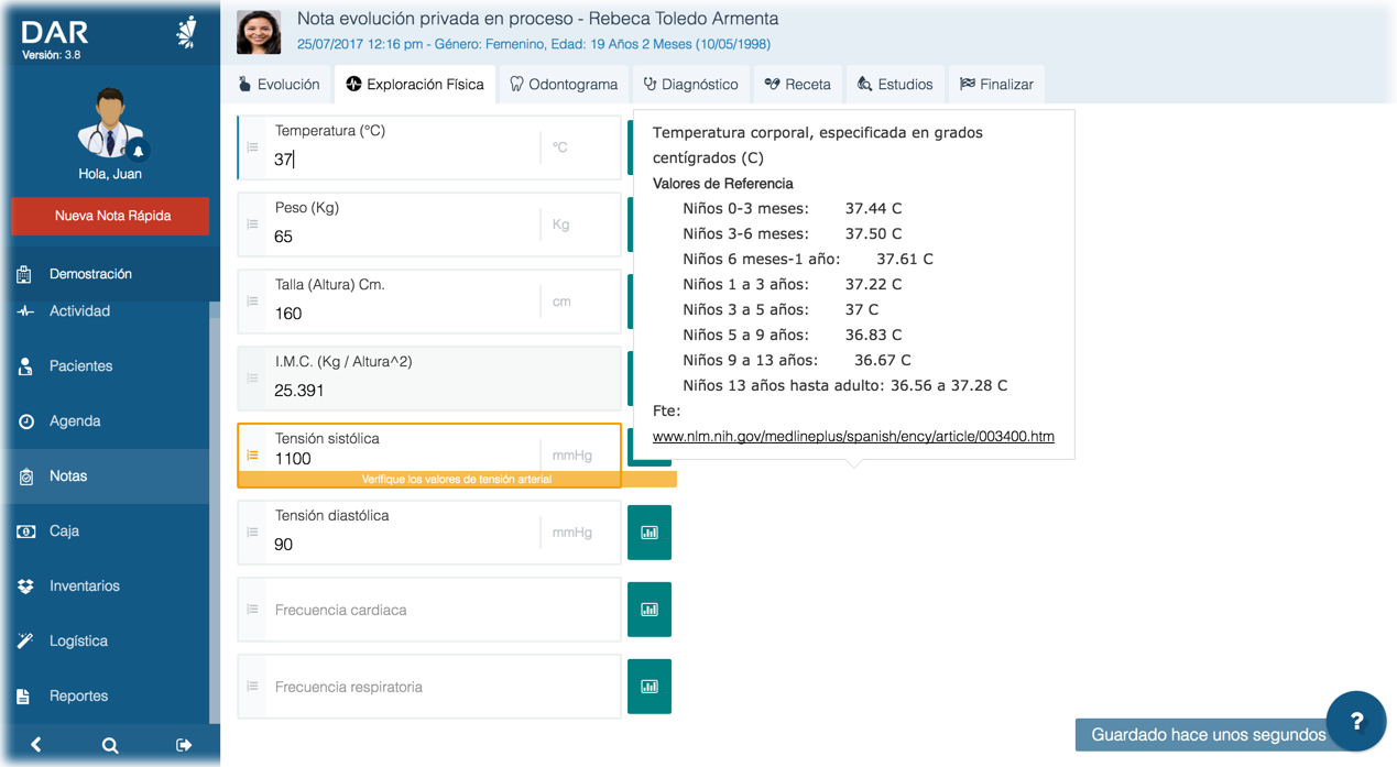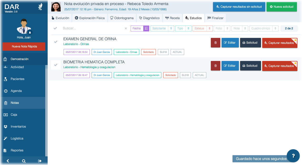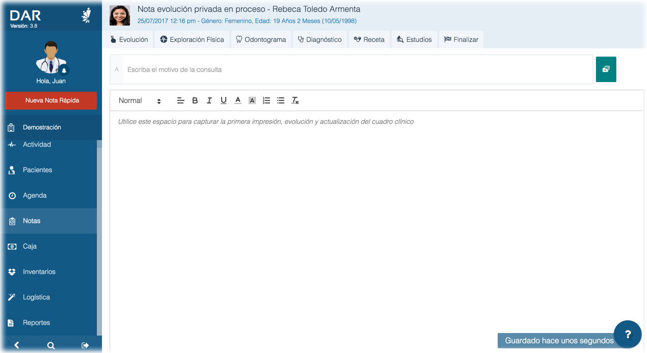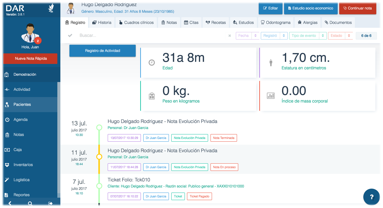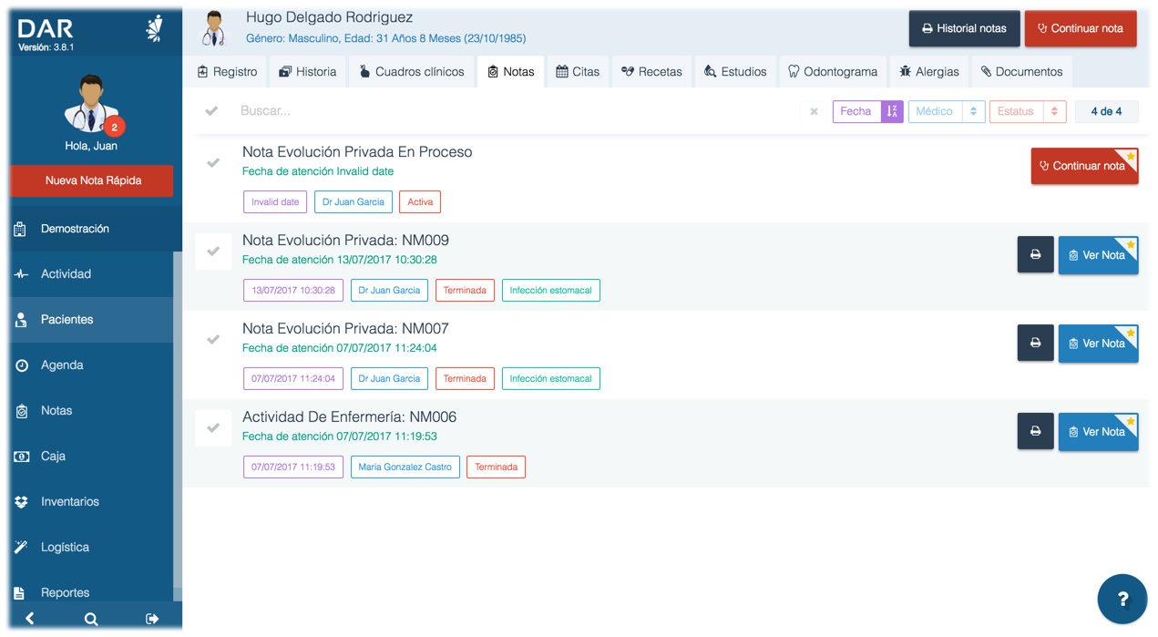 Colección de notas de todo tipo realizadas al paciente, es posible imprimir resúmenes y ver a detalle.