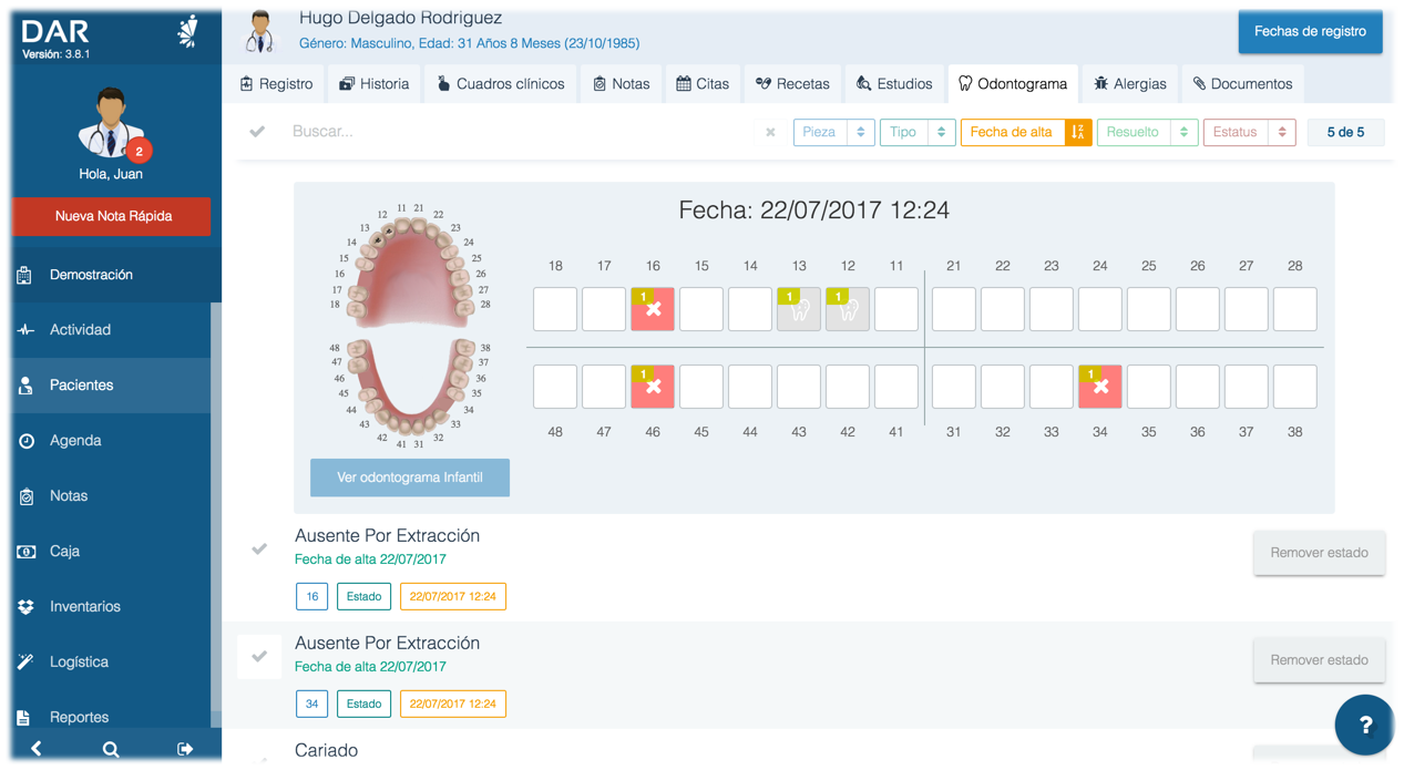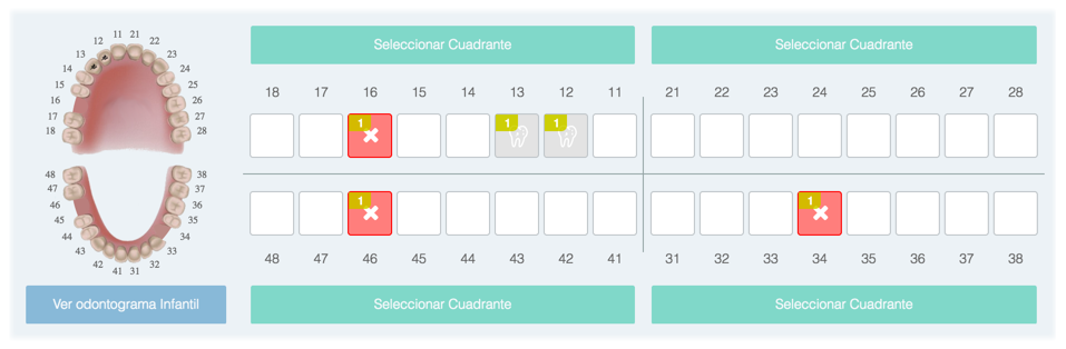 Representación gráfica del odontograma del paciente, estados de cada pieza y procedimientos pendientes.