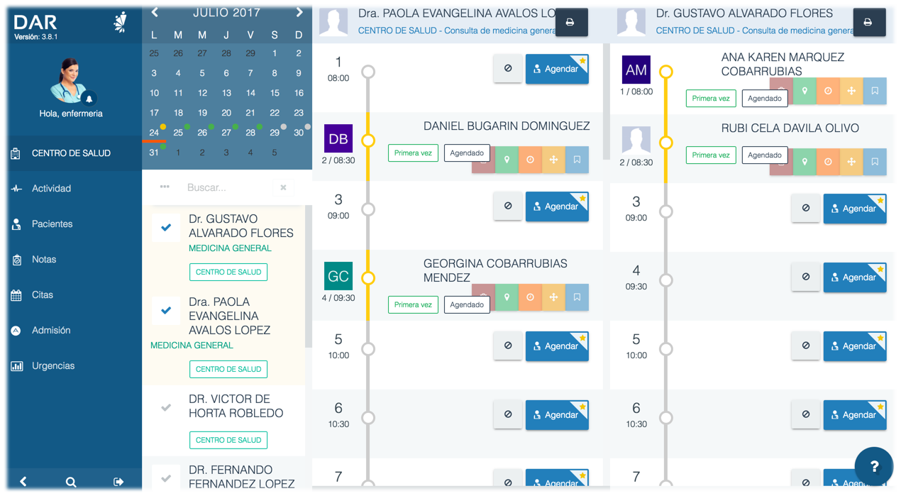 Agenda particular del médico, desde ella puede iniciar la consulta o ver el expediente del paciente.