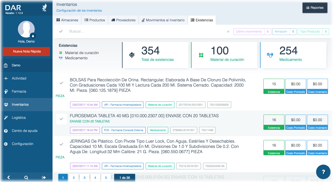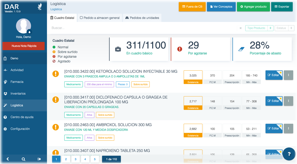 Control de la logística de pedidos de la clínica, pedidos sugeridos, alertas de desabasto, promedios, etc.