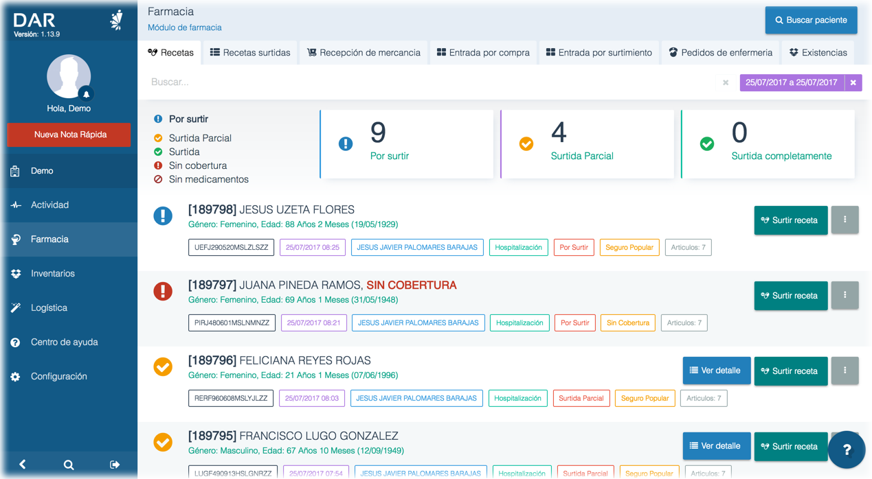 Listado y despacho de recetas realizadas en la clínica, manejo de lotes y caducidades.