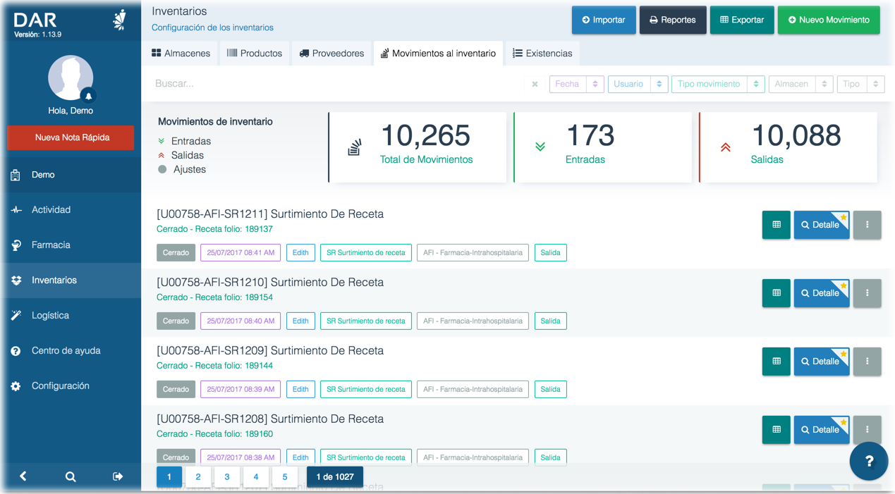 Registro y visualización de todos los movimientos del inventario, altamente configurable.