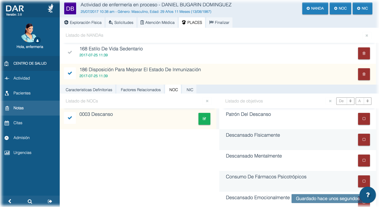 Actividades de enfermería como dietas, administración de medicamentos, PLACES, somatometría, etc.