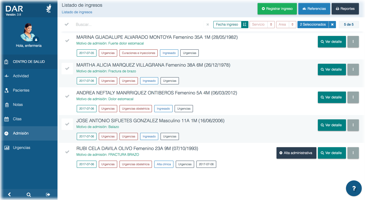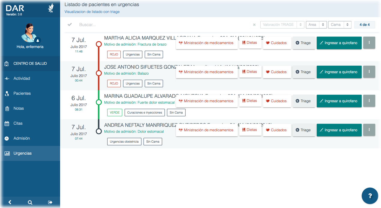 Atención al paciente en urgencias, ingreso a quirófano, notas, asignación de cama, triage, etc.