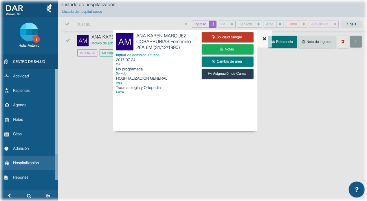 Sección para el seguimiento y control del hospitalizado, asignación de cama, estudios, notas, etc.