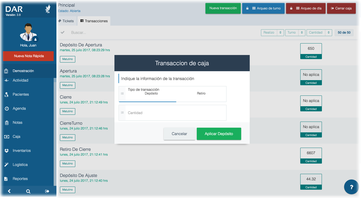 Listado de transacciones como cierre de día, corte de turno, arqueo, depósitos, retiros, etc.