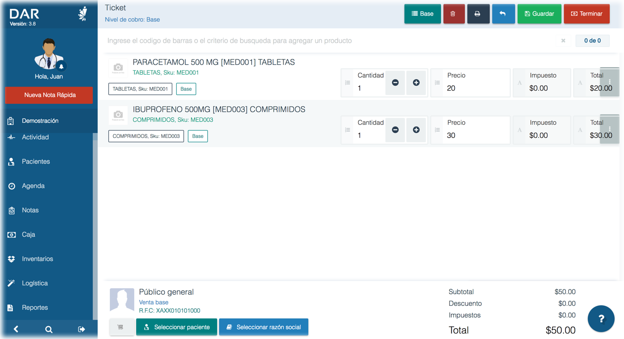 Venta de servicios o productos de la clínica, cuenta con impresión de ticket y manejo de bandeja de cargos.