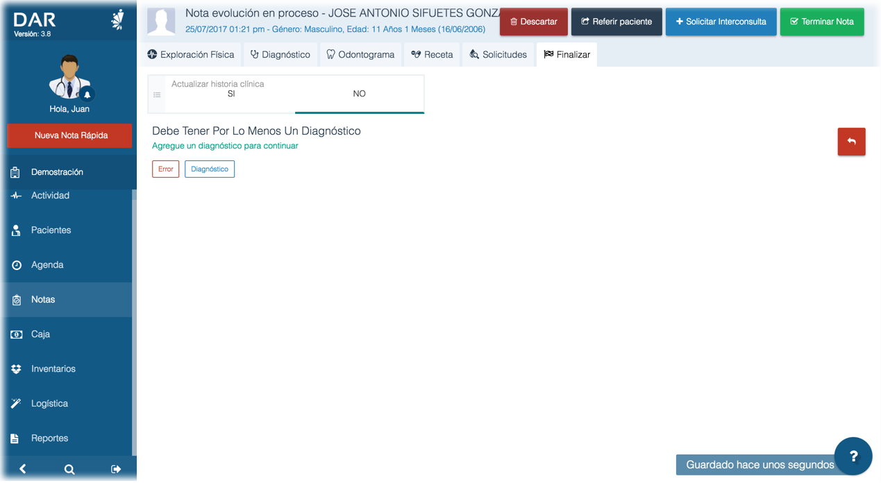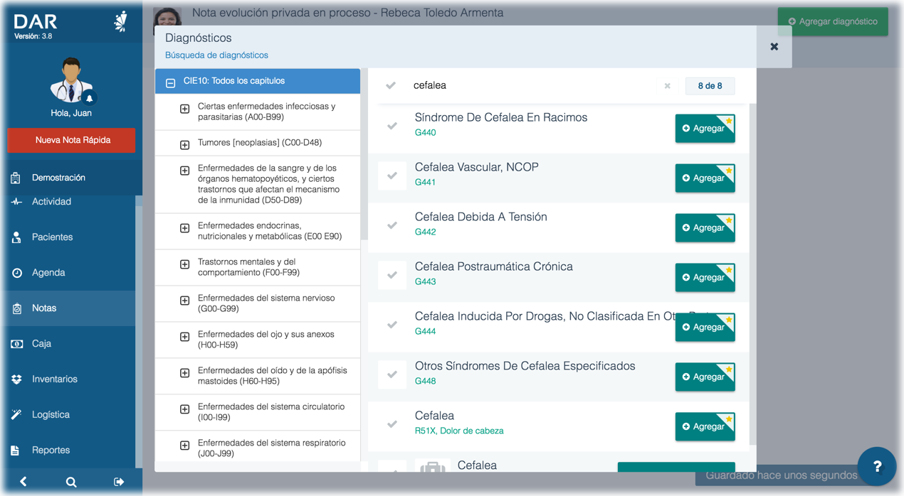 Diagnóstico del paciente puede seleccionarse desde el árbol CIE10 buscar por clave o nombre común.